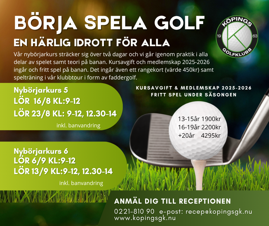 Våra nybörjarkurser genomförs i regel under två dagar, med praktik i alla delar av spelet samt teori på banan. Under första dagen ligger fokus på de praktiska delarna i sving, puttning och närspel. Under dag två fortsätter vi med praktik,