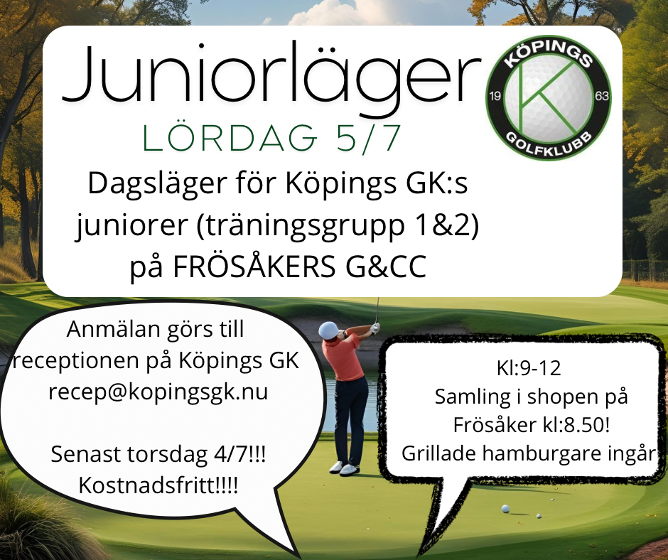 Tränare Fredrik Angnero håller i dagslägret på Frösåker på lördag 4 juli. Vi grillar hamburgare och lägret är kostnadsfritt. Samling på Frösåker 08:50. Senast anmälan till receptionen på Köpings GK torsdag 3 juli. Anmälan görs till receptionen pronto! Kontakta receptionen
