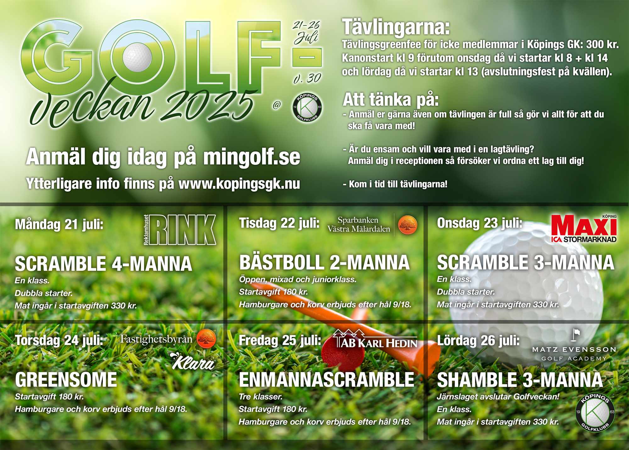 Golfveckan 2025 går av stapeln i vanlig ordning mån-lör vecka 30 i juli. Vår Golfvecka har vuxit de senaste fem åren och blivit en mycket uppskattad och populär vecka för medlemmar och tillresta gäster som uppskattar spel på en fin