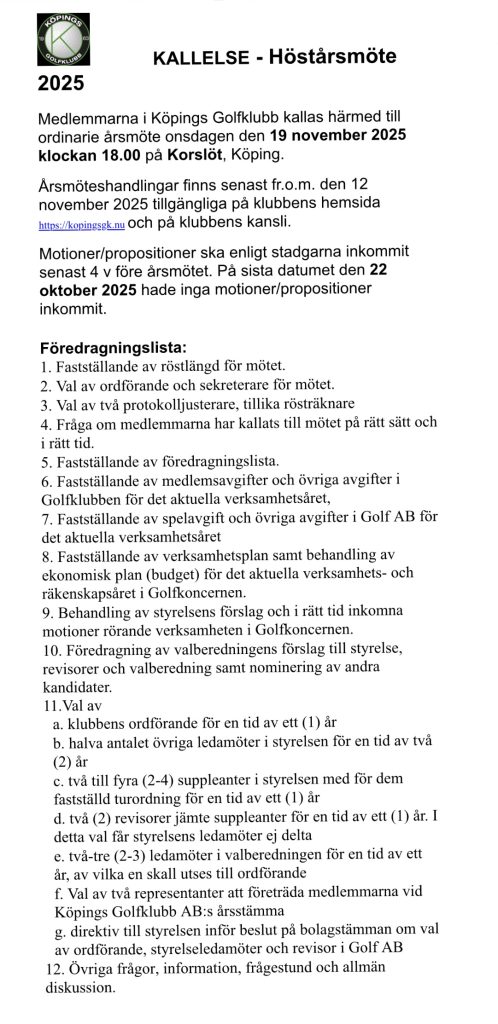 Varmt välkomna alla medlemmar i Köpings Golfklubb till Höstårsmötet som vi håller i klubbhuset kl:18.00 onsdagen den 19 november.